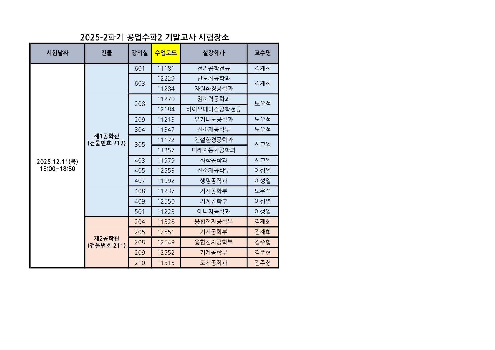 | 2025-2 공업수학2 기말고사 시험장소 안내 | ||
