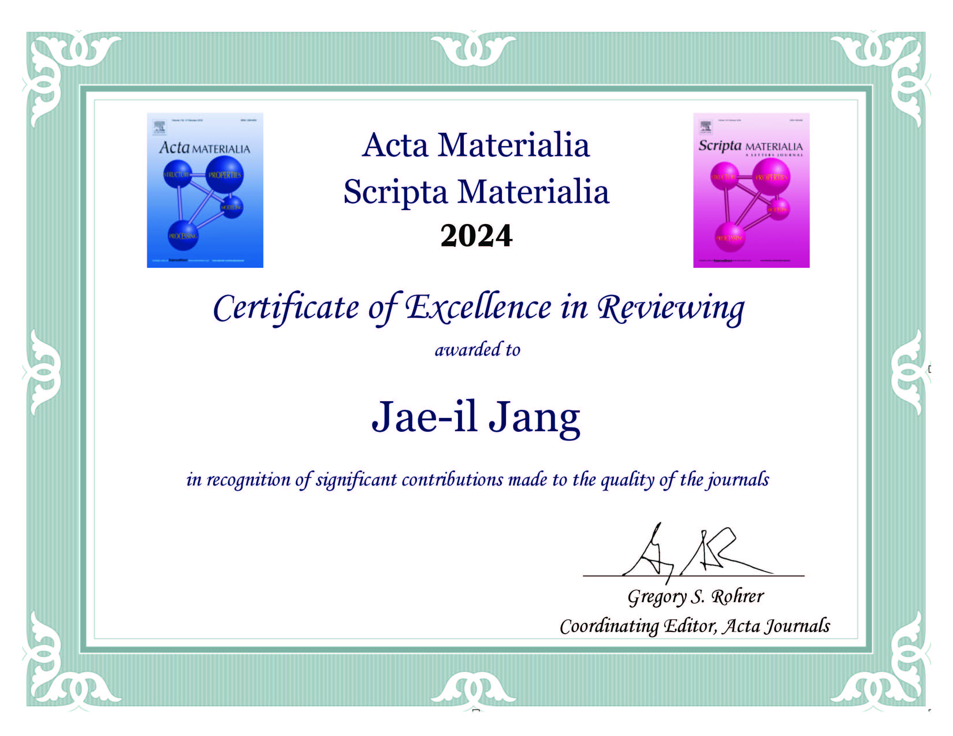 - Prof. Jang was selected as an excellent reviewer for Acta Mater./Scripta Mater. 2024 (Sep. 20, 2025).